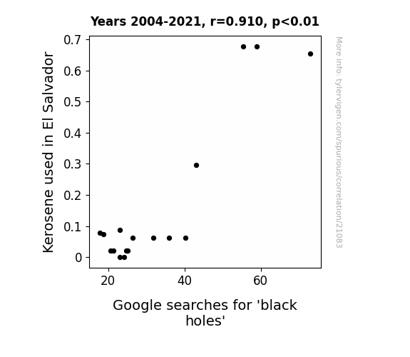 This means 82.8% of the change in the one variable (i.e., Google searches for 'black holes') is predictable based on the change in the other (i.e., Kerosene used in El Salvador) over the 18 years from 2004 through 2021.