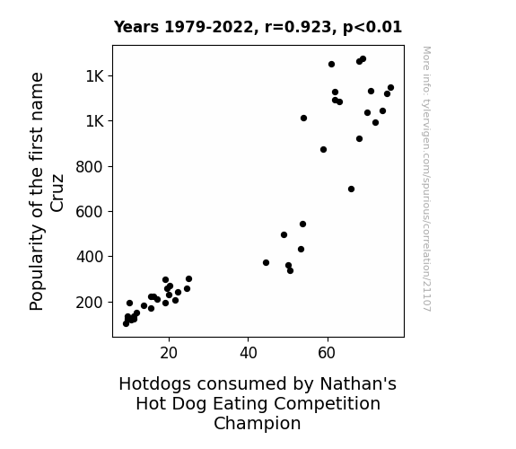 This means 85.2% of the change in the one variable (i.e., Hotdogs consumed by Nathan's Hot Dog Eating Competition Champion) is predictable based on the change in the other (i.e., Popularity of the first name Cruz) over the 44 years from 1979 through 2022.