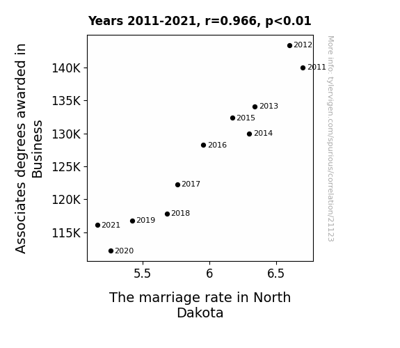This means 93.4% of the change in the one variable (i.e., The marriage rate in North Dakota) is predictable based on the change in the other (i.e., Associates degrees awarded in Business) over the 11 years from 2011 through 2021.