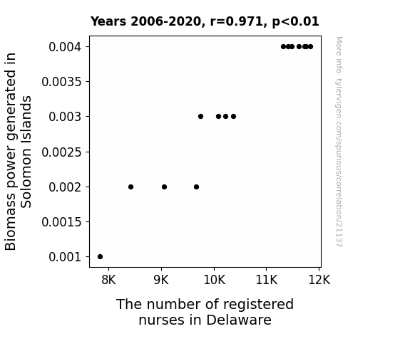 This means 94.2% of the change in the one variable (i.e., The number of registered nurses in Delaware) is predictable based on the change in the other (i.e., Biomass power generated in Solomon Islands) over the 15 years from 2006 through 2020.