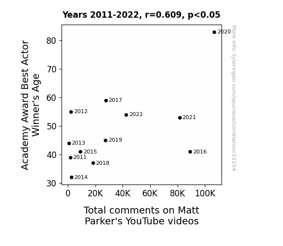 This means 37.1% of the change in the one variable (i.e., Total comments on Matt Parker's YouTube videos) is predictable based on the change in the other (i.e., Academy Award Best Actor Winner's Age) over the 12 years from 2011 through 2022.