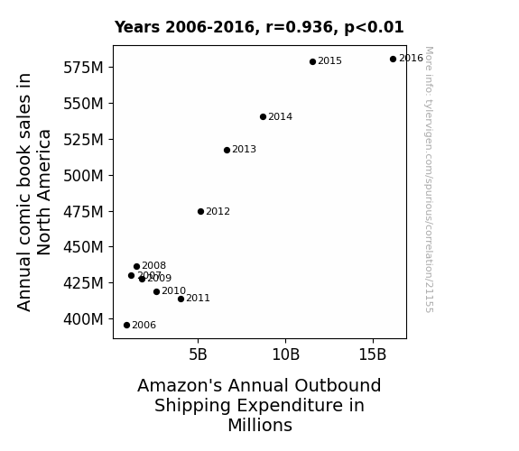 This means 87.6% of the change in the one variable (i.e., Amazon's Annual Outbound Shipping Expenditure in Millions) is predictable based on the change in the other (i.e., Annual comic book sales in North America) over the 11 years from 2006 through 2016.
