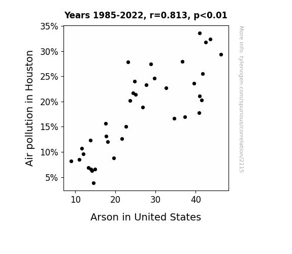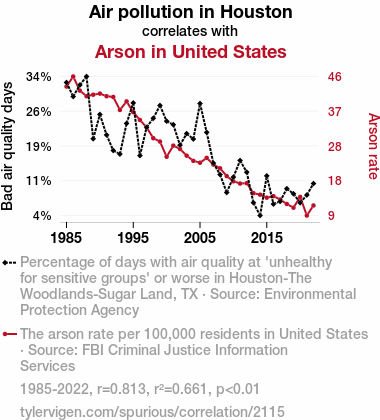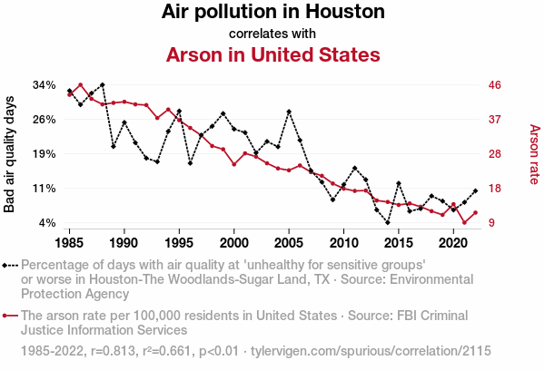 - The spurious research paper: Burning Concerns: Unveiling the Link between Air Pollution in the Bayou City and Arson in the Stars and Stripes