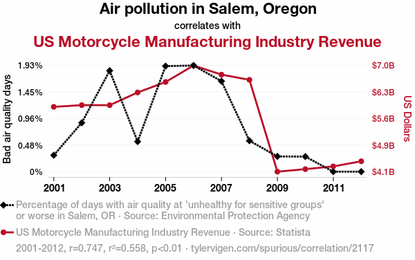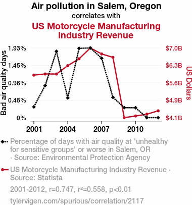 - The spurious research paper: Revving Up Revenue: The Hazards of Air Pollution on the Motorcycle Manufacturing Industry in Salem, Oregon