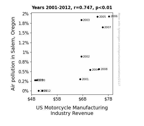 The data analysis revealed a noteworthy correlation coefficient of 0.7467266, indicating a strong positive relationship between air pollution in Salem, Oregon and the revenue of the US motorcycle manufacturing industry. This unexpected connection had us feeling as baffled as a researcher stumbling upon a hidden treasure trove in the dusty archives of academia.