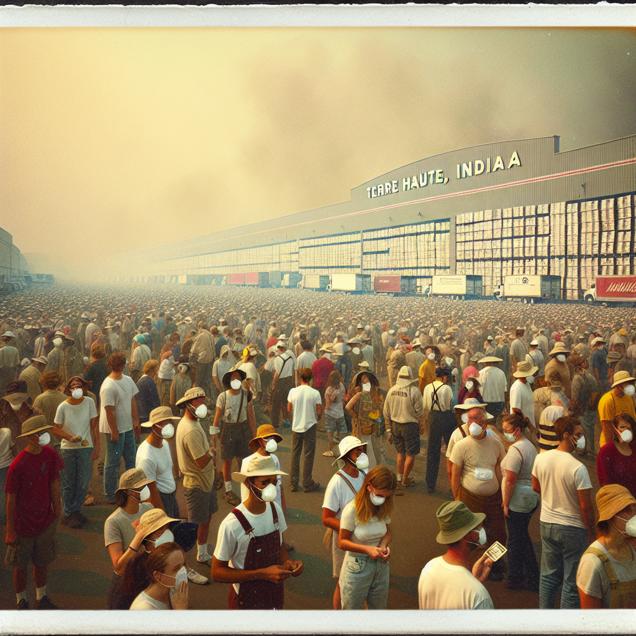 Prompt: Create an image as if it were taken with a Polaroid camera depicting a scene in Terre Haute, Indiana. The sky above is tinted with a hazy smog, and people are wearing masks to shield themselves from the unhealthy air quality. In the background stands a towering warehouse, where workers are seen loading physical albums onto waiting trucks - a testament to the high shipment volume of physical albums in the United States. The depiction should include only scenes, people, and objects, it should not include text or speech bubbles.