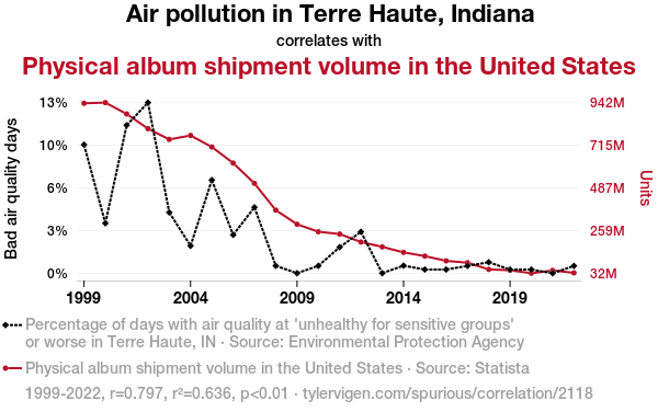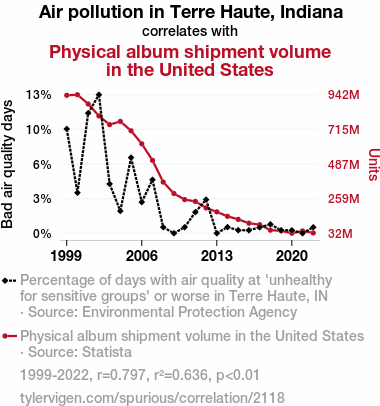 - The spurious research paper: The Dirty Truth: Air Pollution in Terre Haute, Indiana and Its Impact on Physical Album Shipment Volume in the United States
