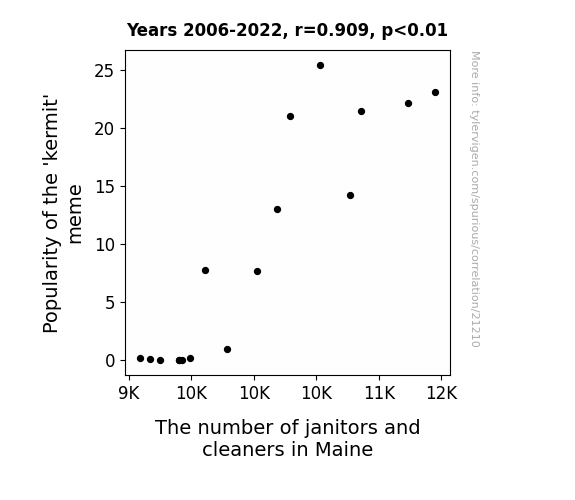 This means 82.7% of the change in the one variable (i.e., The number of janitors and cleaners in Maine) is predictable based on the change in the other (i.e., Popularity of the 'kermit' meme) over the 17 years from 2006 through 2022.
