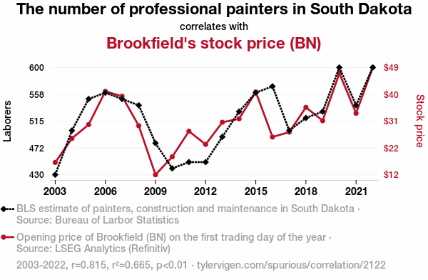 This means 66.5% of the change in the one variable (i.e., Brookfield's stock price (BN)) is predictable based on the change in the other (i.e., The number of professional painters in South Dakota) over the 20 years from 2003 through 2022.