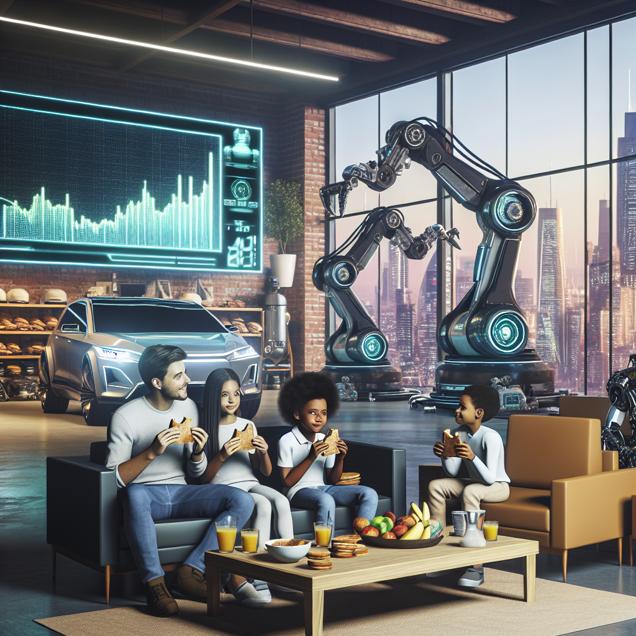Prompt: Generate an image of a futuristic scene in which a family is relishing grilled cheese sandwiches together in a sleek, modern waiting area at an AutoZone store. In the background, their car is being serviced by advanced robotic arms. The large TV screen on the wall displays AutoZone's stock price increasing amidst a backdrop of futuristic cityscape. The atmosphere is warm and inviting, yet imbued with the sense of technological progress and advancement. The depiction should include only scenes, people, and objects, it should not include text or speech bubbles.