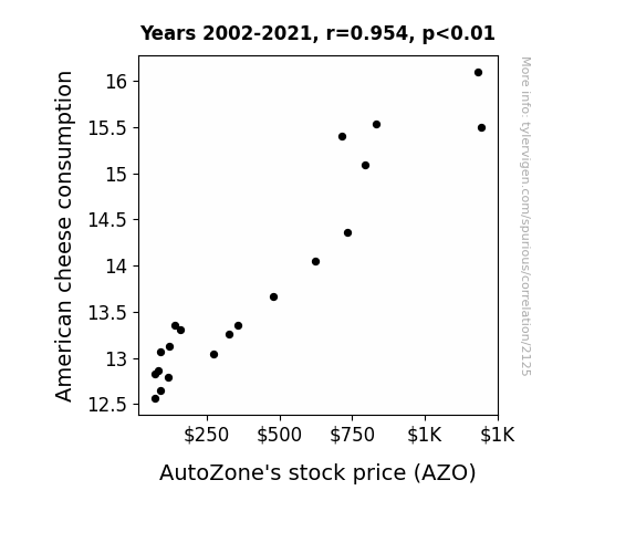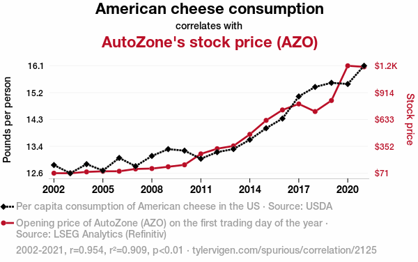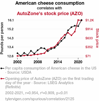 - The spurious research paper: Cheddar Cha-Ching: The Cheesy Connection Between American Cheese Consumption and AutoZone's Stock Price