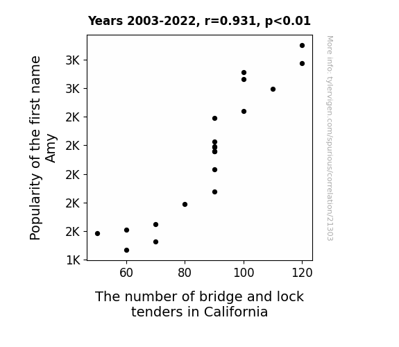 This means 86.7% of the change in the one variable (i.e., The number of bridge and lock tenders in California) is predictable based on the change in the other (i.e., Popularity of the first name Amy) over the 20 years from 2003 through 2022.