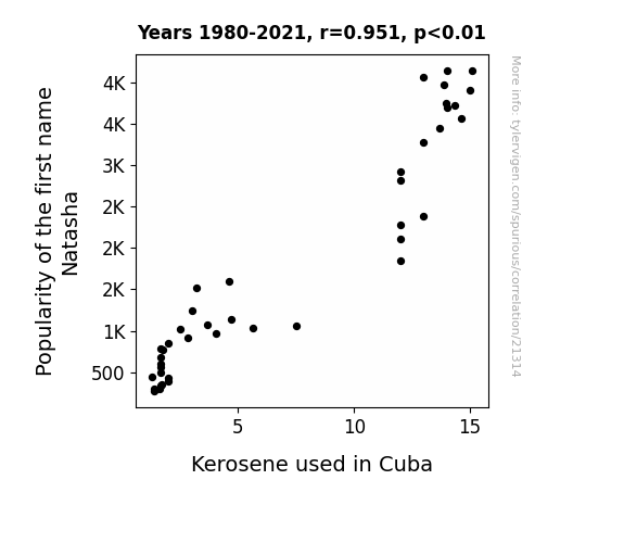 This means 90.5% of the change in the one variable (i.e., Kerosene used in Cuba) is predictable based on the change in the other (i.e., Popularity of the first name Natasha) over the 42 years from 1980 through 2021.
