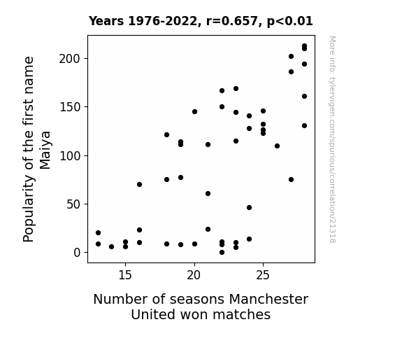 This means 43.2% of the change in the one variable (i.e., Number of seasons Manchester United won matches) is predictable based on the change in the other (i.e., Popularity of the first name Maiya) over the 47 years from 1976 through 2022.