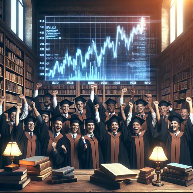 Prompt: Generate an image of a serene library setting with shelves of ancient tomes and a group of students in elegant graduation gowns, their jubilant faces illuminated by the warm glow of brass reading lamps. The scene is focused on the students receiving their Master's degrees in English language and literature/letters. Adjacent to them, a digital screen displays the Cenovus Energy stock price graph, conveying a steady upward trend symbolizing the company's positive growth. Capture the contrast between the scholarly celebration and the modern financial indicator with a sense of depth and tranquility. The depiction should include only scenes, people, and objects, it should not include text or speech bubbles.