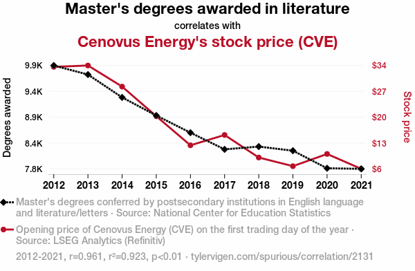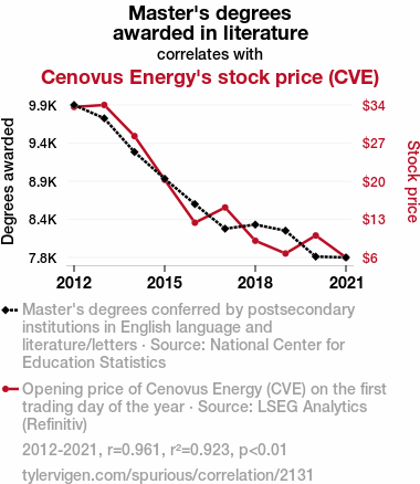 - The spurious research paper: Masters in Metaphors and Markets: Exploring the Elysian Link between English Masters Degrees and Cenovus Energy Stock Prices