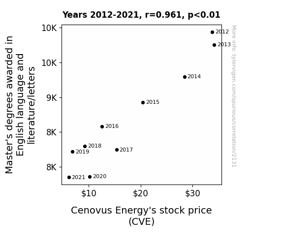 This means 92.3% of the change in the one variable (i.e., Cenovus Energy's stock price (CVE)) is predictable based on the change in the other (i.e., Master's degrees awarded in literature) over the 10 years from 2012 through 2021.
