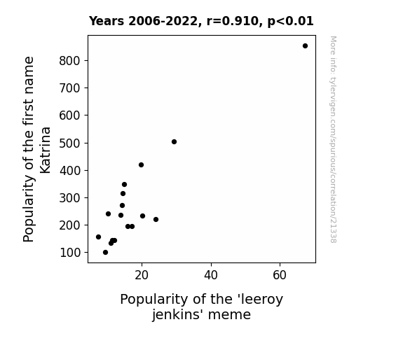 This means 82.8% of the change in the one variable (i.e., Popularity of the 'leeroy jenkins' meme) is predictable based on the change in the other (i.e., Popularity of the first name Katrina) over the 17 years from 2006 through 2022.