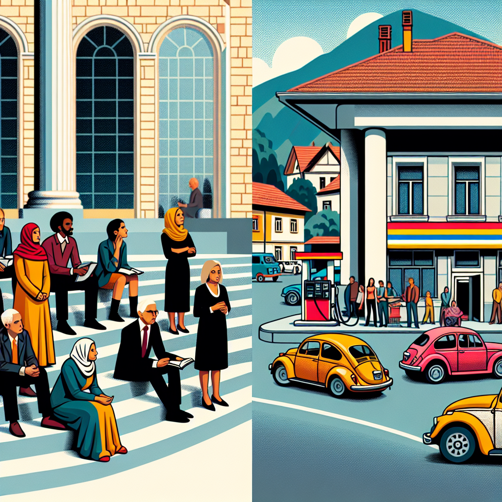 ChatGPT: In a peaceful college campus in Tennessee, a group of sociology teachers gather on the steps of a historic building, engaged in a lively discussion. Meanwhile, on a bustling street in Serbia, a line of cars wait their turn to be filled up at a vibrant gasoline station.
