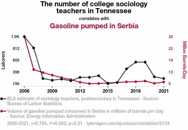 This means 58.3% of the change in the one variable (i.e., Gasoline pumped in Serbia) is predictable based on the change in the other (i.e., The number of college sociology teachers in Tennessee) over the 16 years from 2006 through 2021.