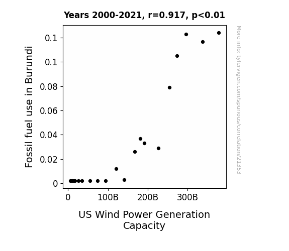 This means 84.2% of the change in the one variable (i.e., US Wind Power Generation Capacity) is predictable based on the change in the other (i.e., Fossil fuel use in Burundi) over the 22 years from 2000 through 2021.