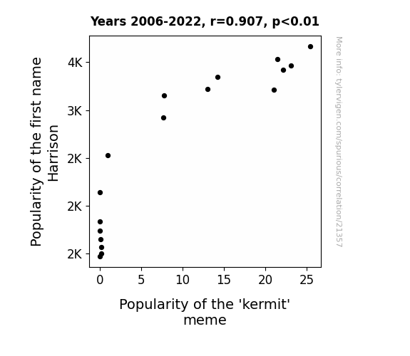 This means 82.3% of the change in the one variable (i.e., Popularity of the 'kermit' meme) is predictable based on the change in the other (i.e., Popularity of the first name Harrison) over the 17 years from 2006 through 2022.
