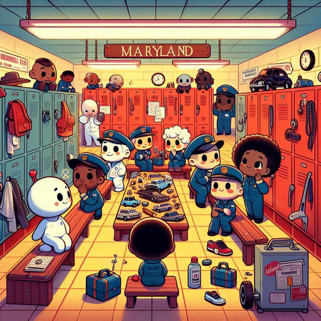 Prompt: [ Cute cartoon ] An illustration of a colorful, vibrant locker room in Maryland with adorable characters tending to the lockers. At the center, a few individuals are shown wistfully looking at car-related tools and equipment, dreaming of future careers as "Car"ina valets or "Car"ina detailers. The room exudes a sense of nostalgia for the days when the name Carina was popular, and there were plenty of aspiring car enthusiasts. The depiction should include only scenes, people, and objects, it should not include text or speech bubbles.