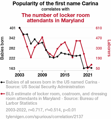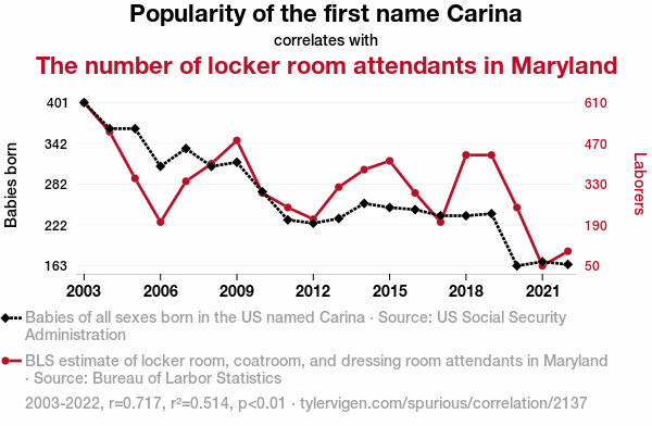 "Carina popularity Maryland," "locker room attendants correlation," "US Social Security Administration data," "Bureau of Labor Statistics analysis," "relationship between name popularity and occupation," "unconventional correlations," "nomenclature and occupational trends"