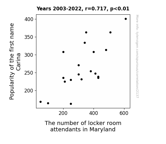 One might wonder, "What could possibly link a name like Carina to the world of locker room attendants?" Well, we too pondered this as we ventured into uncharted statistical territory, armed with spreadsheets and a strong sense of curiosity. It's as if the universe decided to tease statisticians with a brainteaser disguised as a peculiar correlation. The only thing missing from this research endeavor is a magnifying glass and a detective's hat!