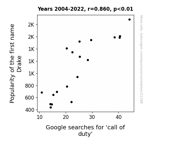 This means 74% of the change in the one variable (i.e., Google searches for 'call of duty') is predictable based on the change in the other (i.e., Popularity of the first name Drake) over the 19 years from 2004 through 2022.