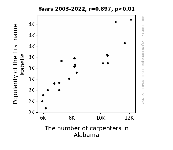 This means 80.4% of the change in the one variable (i.e., The number of carpenters in Alabama) is predictable based on the change in the other (i.e., Popularity of the first name Isabelle) over the 20 years from 2003 through 2022.