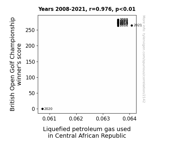 This means 95.3% of the change in the one variable (i.e., Liquefied petroleum gas used in Central African Republic) is predictable based on the change in the other (i.e., British Open Golf Championship winner's score) over the 14 years from 2008 through 2021.