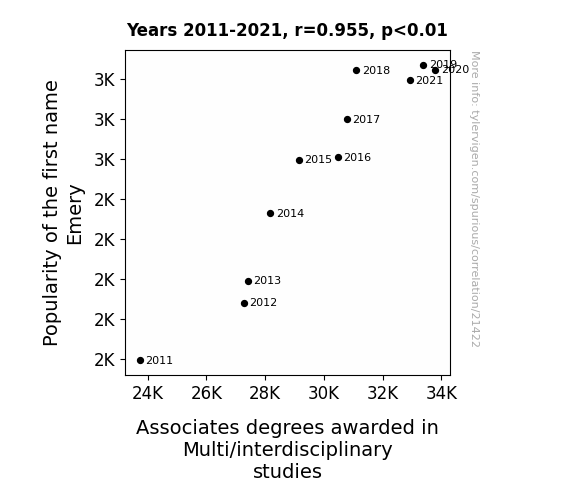 A linear line chart with years as the X-axis and two variables on the Y-axis. The first variable is Popularity of the first name Emery and the second variable is Associates degrees awarded in Multi/interdisciplinary studies.  The chart goes from 2011 to 2021, and the two variables track closely in value over that time. Small Image