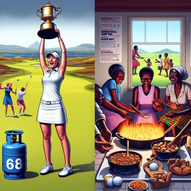 Prompt: Generate an image of a Discovery magazine cover featuring a triumphant golfer holding the British Open Championship trophy on a lush Scottish golf course. The golfer is raising the trophy in celebration, with a score of 68 displayed prominently nearby. In the background, families in the Central African Republic are depicted cooking delicious meals using Liquefied Petroleum Gas, creating a warm and inviting atmosphere. The image should convey the excitement of victory in Scotland alongside the comfort and joy of cooking in Central African Republic. The depiction should include only scenes, people, and objects, it should not include text or speech bubbles.
