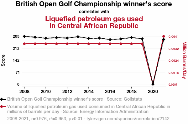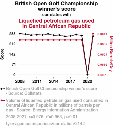 - The spurious research paper: Par for the Course: Uncovering the Correlation Between British Open Golf Championship Winner's Score and Liquefied Petroleum Gas Consumption in Central African Republic