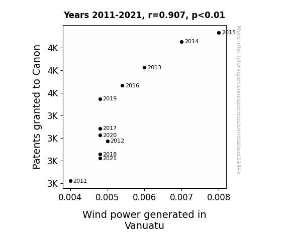This means 82.3% of the change in the one variable (i.e., Wind power generated in Vanuatu) is predictable based on the change in the other (i.e., Patents granted to Canon) over the 11 years from 2011 through 2021.
