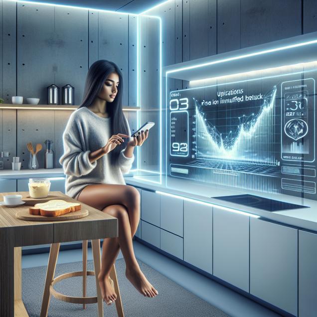 Prompt: Generate an image of a futuristic scene with a person sitting in a sleek, minimalistic kitchen, holding a piece of warm toast generously spread with creamy butter. The person is absorbed in their phone, which displays a sleek, futuristic graph depicting the Intercontinental Exchange's stock price rising steadily. The entire scene exudes a futuristic, minimalist aesthetic, with clean lines, high-tech devices, and a sense of tranquility. The depiction should include only scenes, people, and objects, it should not include text or speech bubbles.
