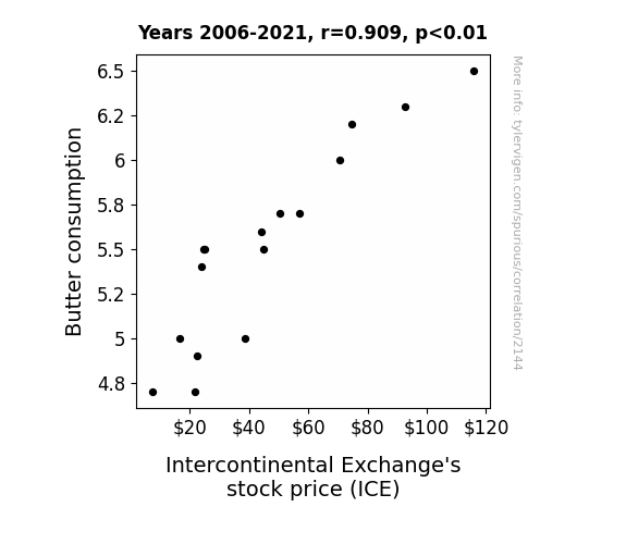 This means 82.6% of the change in the one variable (i.e., Intercontinental Exchange's stock price (ICE)) is predictable based on the change in the other (i.e., Butter consumption) over the 16 years from 2006 through 2021.