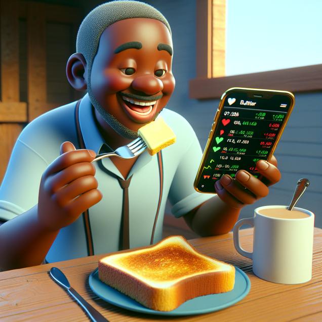 ChatGPT: A person enjoying a piece of toast with a generous spread of butter, while checking the Infosys stock price on their smartphone.