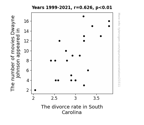 This means 39.2% of the change in the one variable (i.e., The divorce rate in South Carolina) is predictable based on the change in the other (i.e., The number of movies Dwayne Johnson appeared in) over the 23 years from 1999 through 2021.