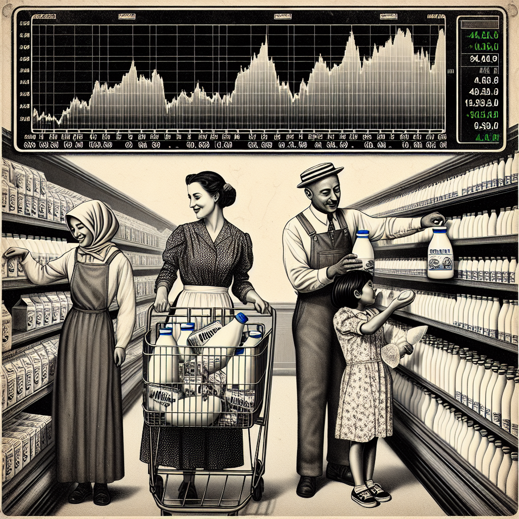User prompt: Please describe a visual scene that prominently depicts both US household spending on fresh milk and cream and Vodafone Group's stock price together. Keep the description simple.