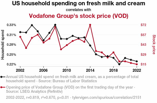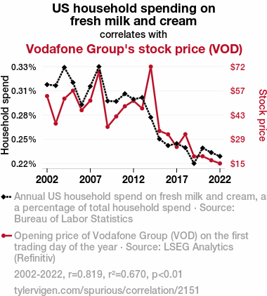 This means 67% of the change in the one variable (i.e., Vodafone Group's stock price (VOD)) is predictable based on the change in the other (i.e., US household spending on fresh milk and cream) over the 21 years from 2002 through 2022.