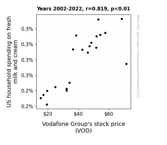 In summary, our results suggest that there is indeed a meaningful association between US household spending on fresh milk and cream and Vodafone Group's stock price, challenging conventional wisdom and raising the question: could the dairy aisle be providing more than just sustenance for our bodies, but also food for thought for our investment portfolios? These findings open a new pasture for future research in the intersection of dairy consumption and financial markets, as we continue to milk every last drop of insight from this unusual yet captivating correlation.