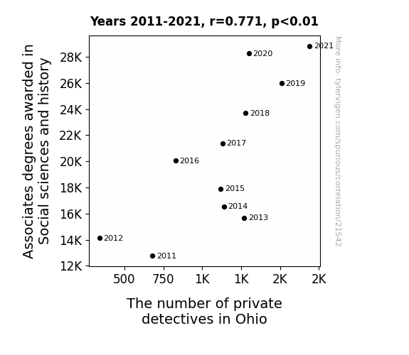 This means 59.5% of the change in the one variable (i.e., The number of private detectives in Ohio) is predictable based on the change in the other (i.e., Associates degrees awarded in Social sciences and history) over the 11 years from 2011 through 2021.