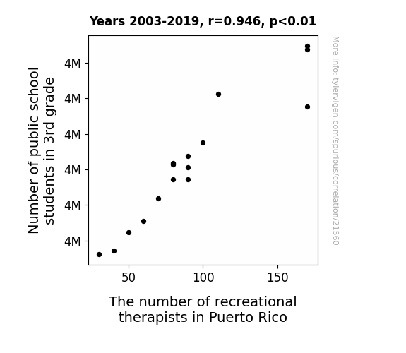This means 89.4% of the change in the one variable (i.e., The number of recreational therapists in Puerto Rico) is predictable based on the change in the other (i.e., Number of public school students in 3rd grade) over the 17 years from 2003 through 2019.