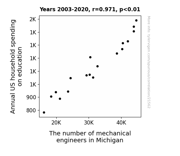 This means 94.2% of the change in the one variable (i.e., The number of mechanical engineers in Michigan) is predictable based on the change in the other (i.e., Annual US household spending on education) over the 18 years from 2003 through 2020.