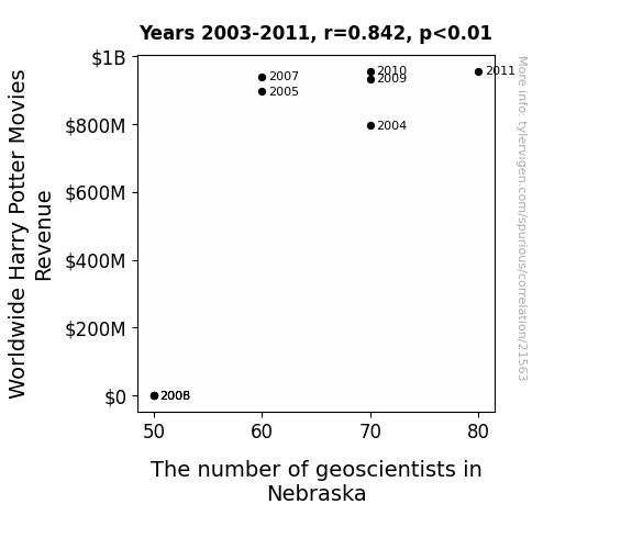 This means 70.9% of the change in the one variable (i.e., The number of geoscientists in Nebraska) is predictable based on the change in the other (i.e., Worldwide Harry Potter Movies Revenue) over the 9 years from 2003 through 2011.