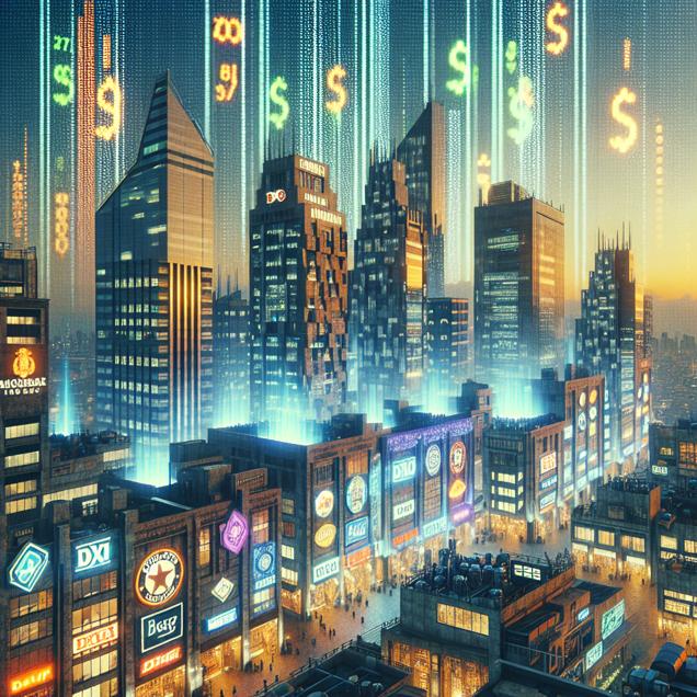 Prompt: Generate an image inspired by a TIME magazine cover, showcasing a futuristic cityscape filled with modern skyscrapers. Each building represents a different brewery, distinguishing itself with unique architecture and signage. The evening sky is illuminated by the glowing digital ticker displaying the current stock price of Salesforce, dominating the skyline with its bright numbers. The scene captures the bustling energy of a city's beer industry and the ever-present influence of the stock market. The depiction should include only scenes, people, and objects, it should not include text or speech bubbles.