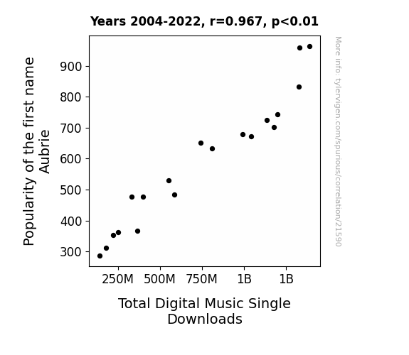 This means 93.6% of the change in the one variable (i.e., Total Digital Music Single Downloads) is predictable based on the change in the other (i.e., Popularity of the first name Aubrie) over the 19 years from 2004 through 2022.