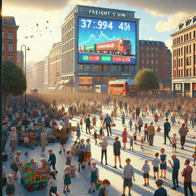 Prompt: "Create a hyper-realistic image of a bustling town square with a large digital billboard displaying the stock price of Old Dominion Freight Line. The square is surrounded by a diverse crowd of people engaged in lively conversations. In the background, a group of children play "Red light, Green light, Walker" in the park. Capture the energy and vibrancy of the scene with attention to detail in the people and surroundings." The depiction should include only scenes, people, and objects, it should not include text or speech bubbles.